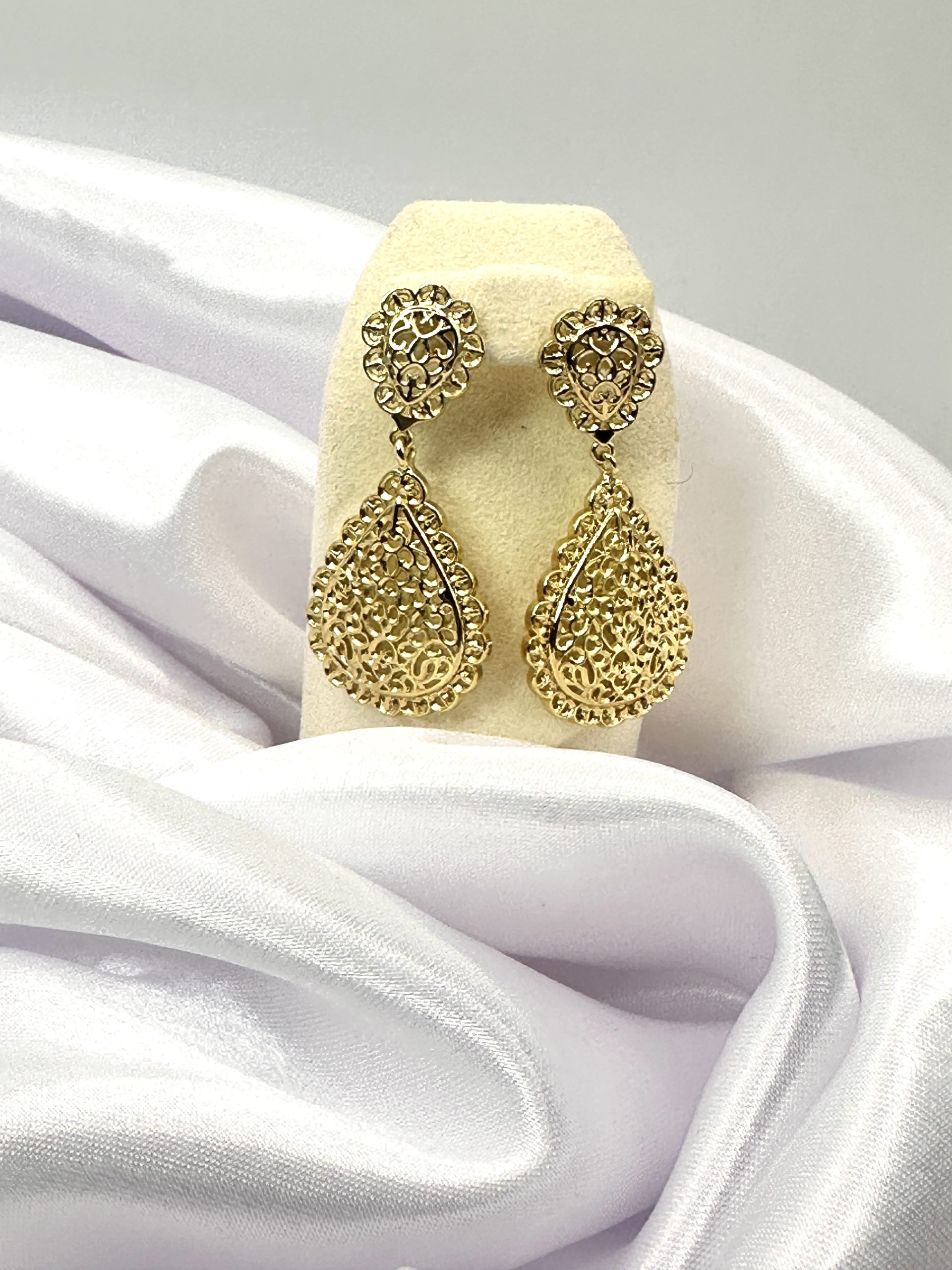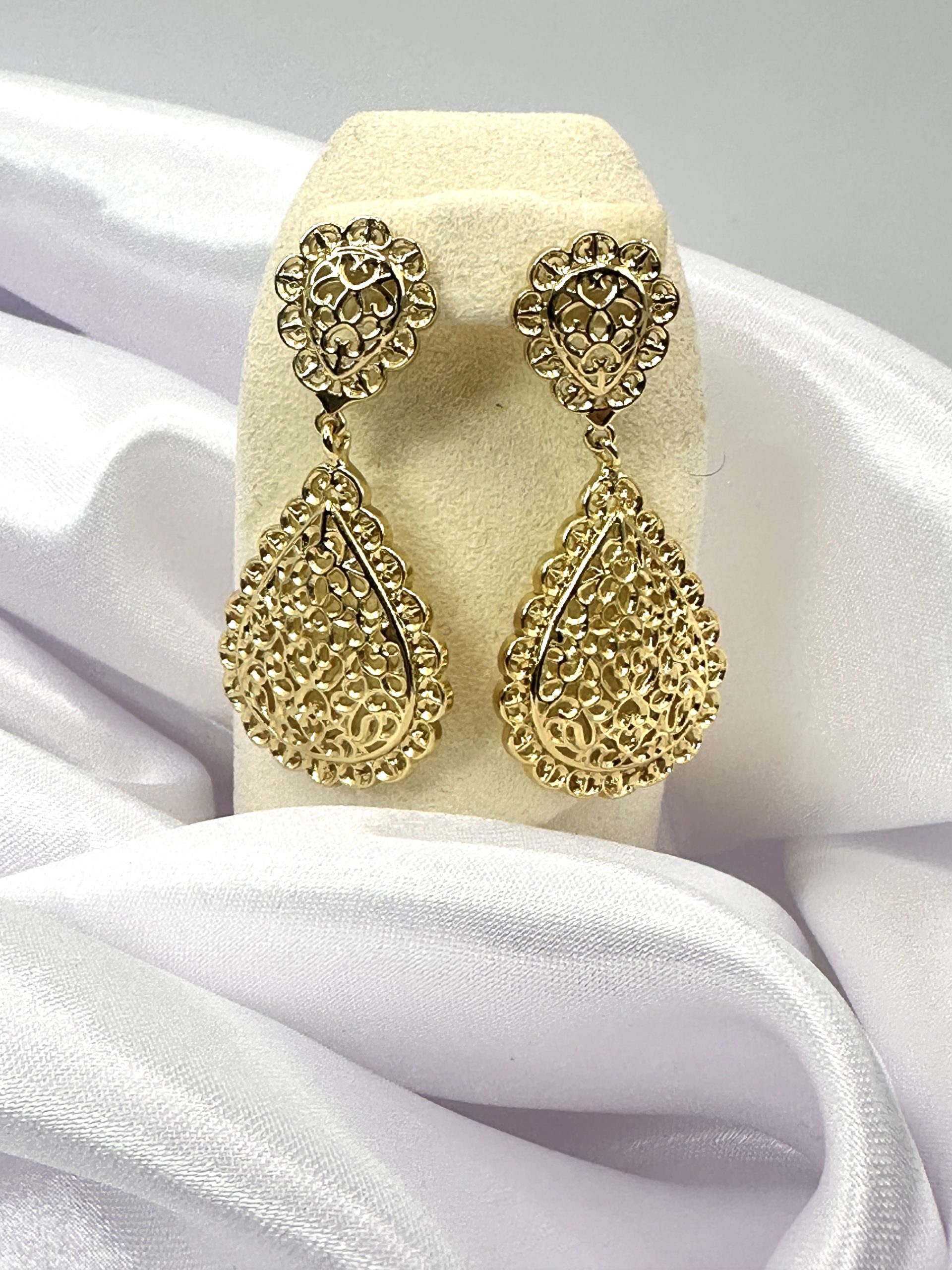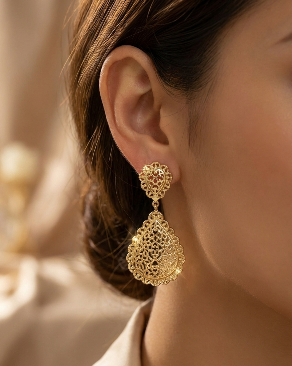 Ces boucles d’oreilles allient tradition et modernité. Inspirées du style tqlidi marocain, elles sont réalisées en acier inoxydable doré de haute qualité, résistant au ternissement et à l’usure.