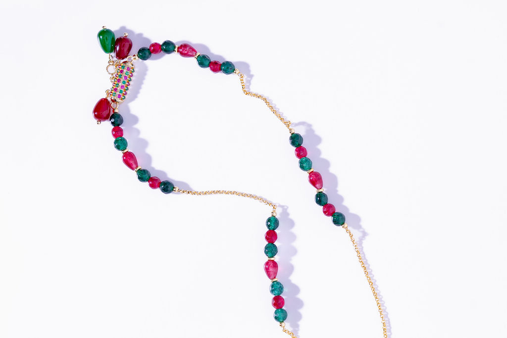 Ce collier raffiné est entièrement monté à la main sur chaîne ajustable. Les perles façon marocaine, symboles de pureté et d’élégance, sont subtilement, apportant modernité et durabilité.