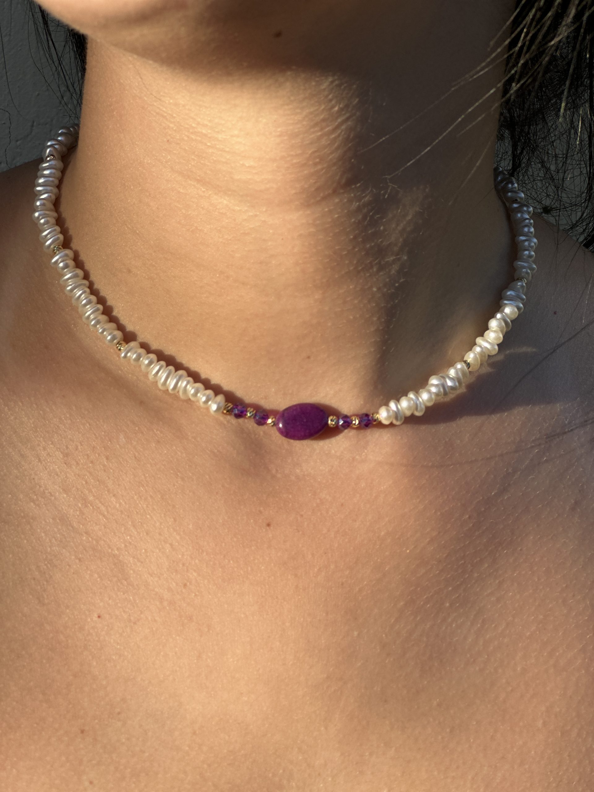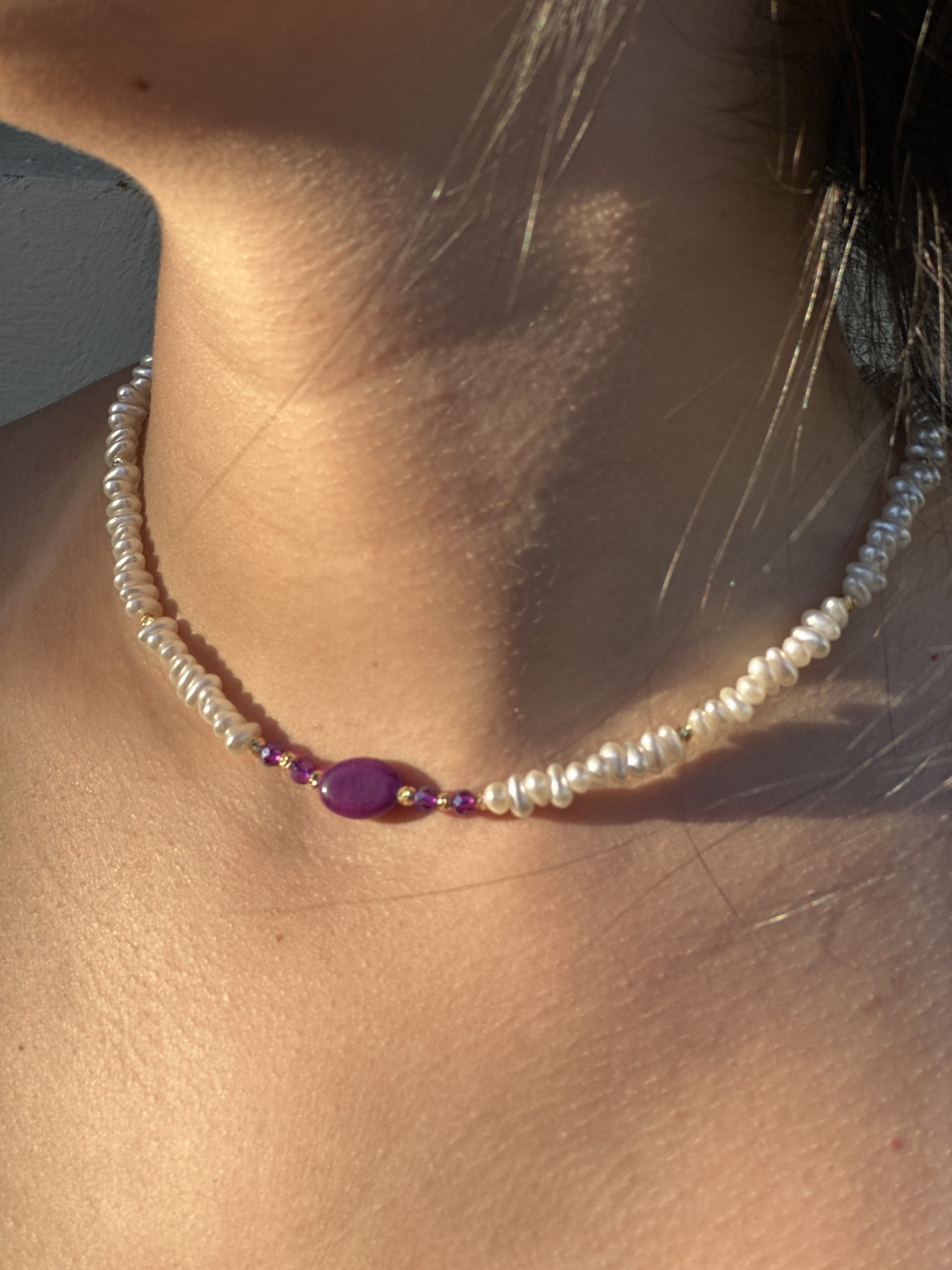 Collier avec perles précieuses et bijoux en acier inoxydable.