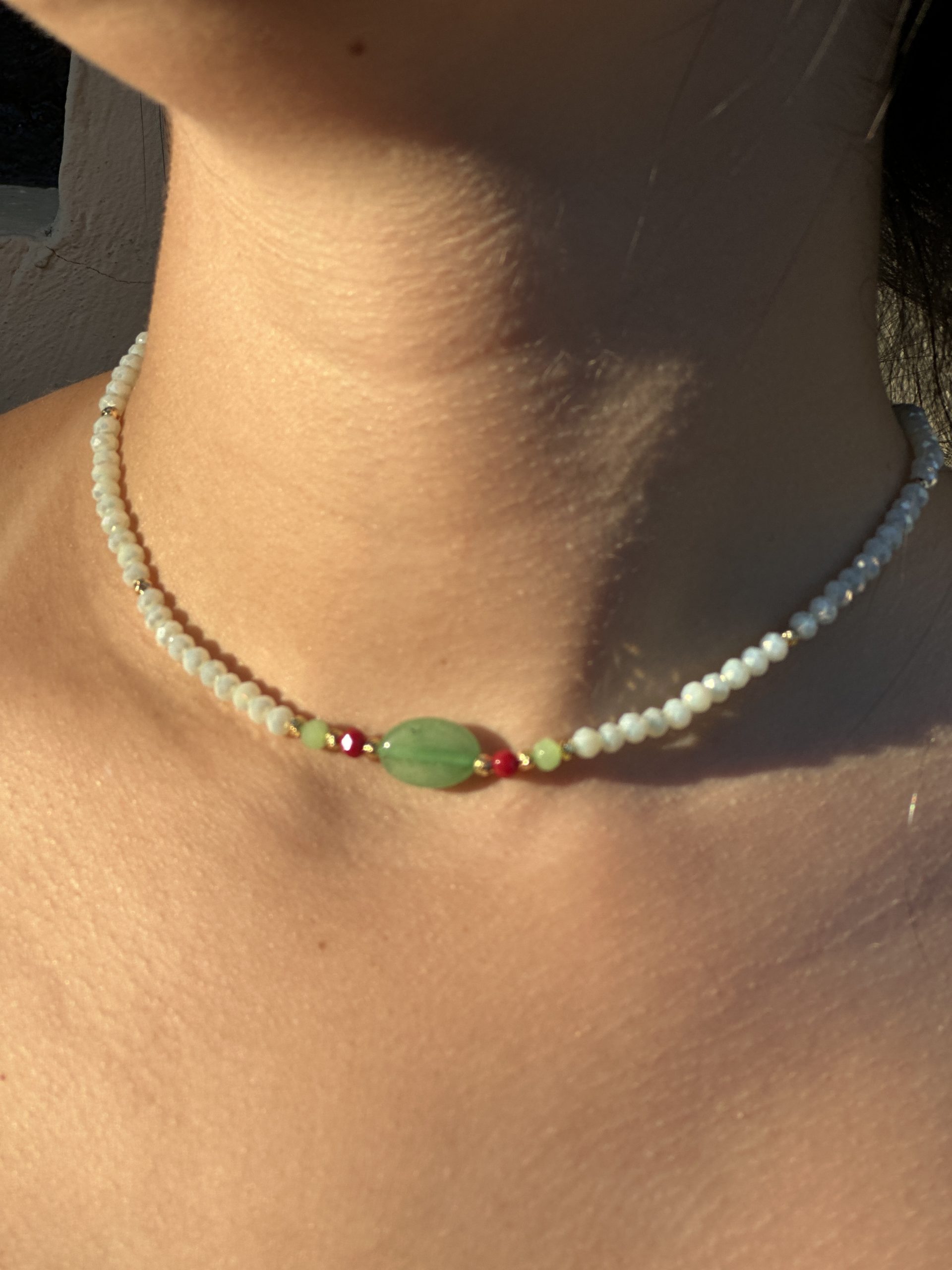 Collier avec perles précieuses et bijoux en acier inoxydable.