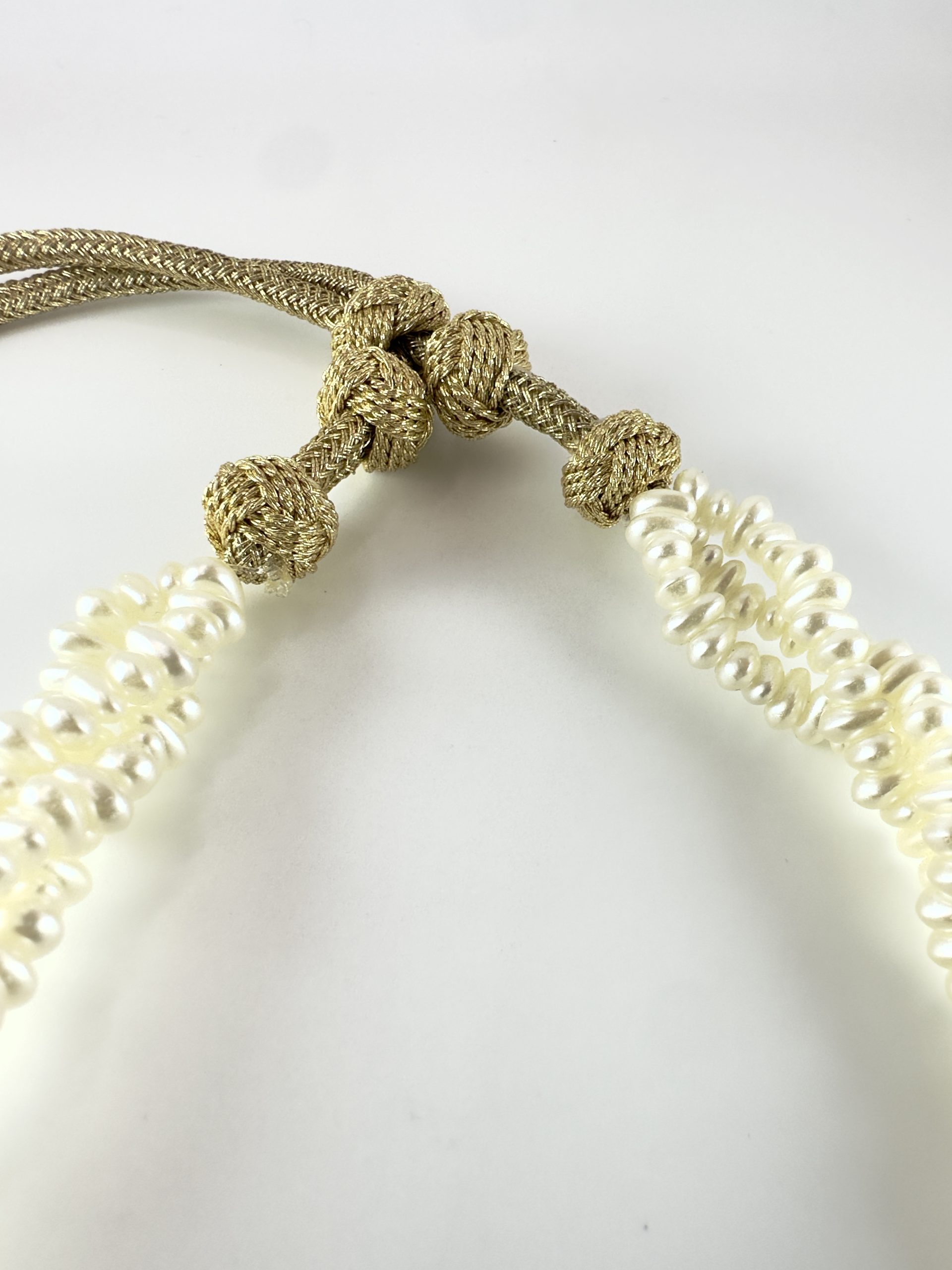 Ce collier raffiné est entièrement monté à la main sur un cordon ajustable. Les perles blanches façon johr marocain, symboles de pureté et d’élégance, sont subtilement, apportant modernité et durabilité.