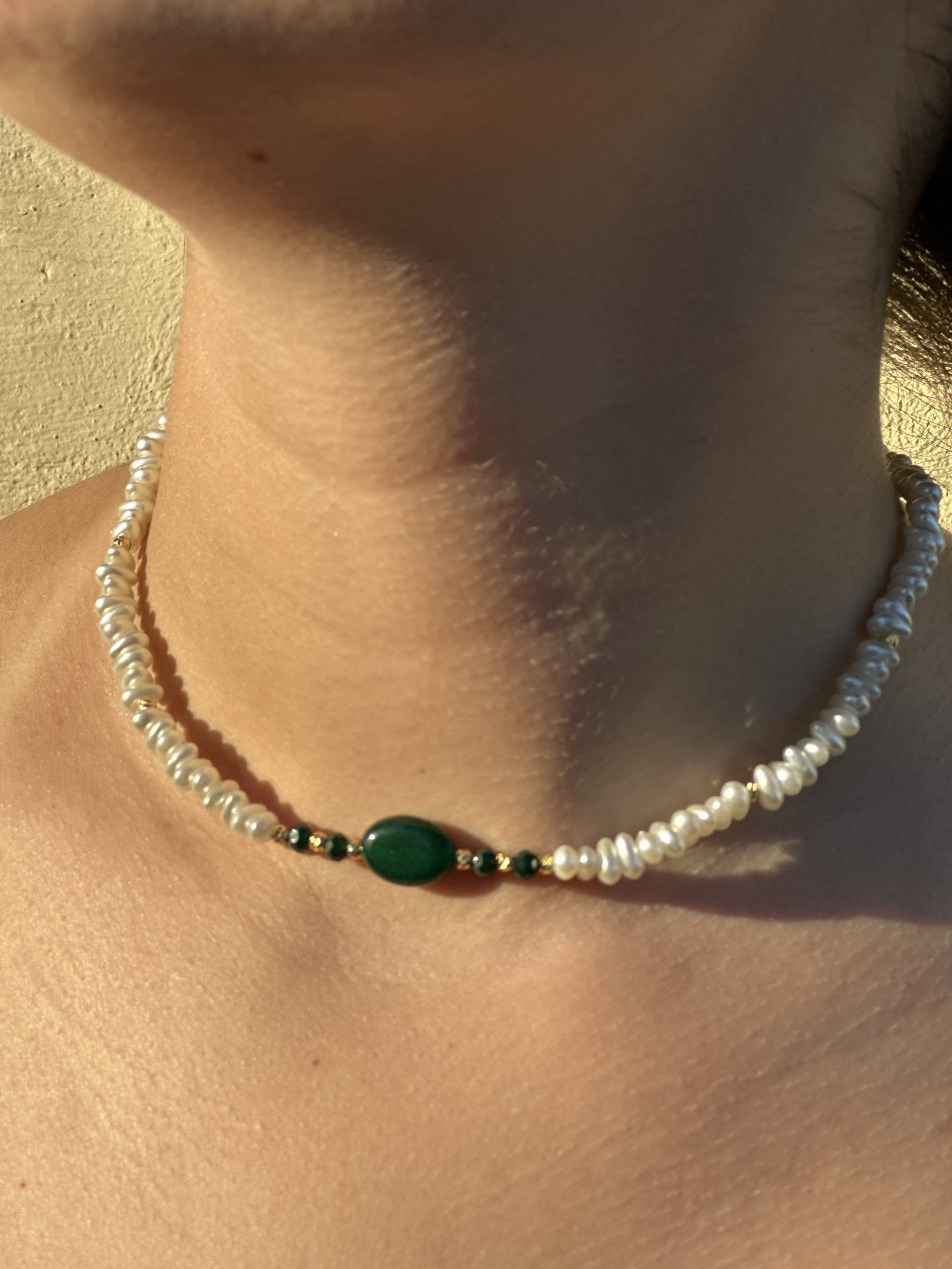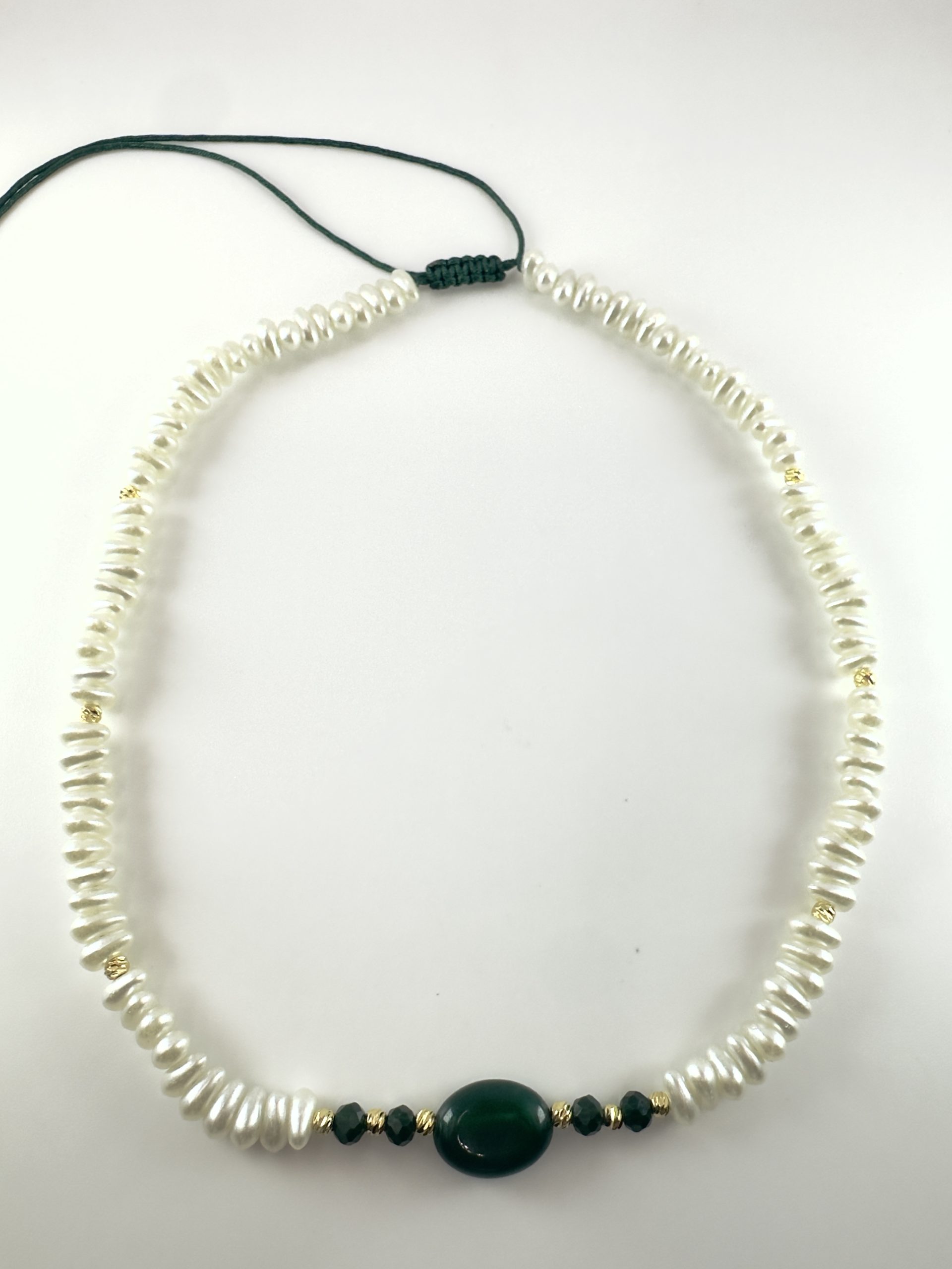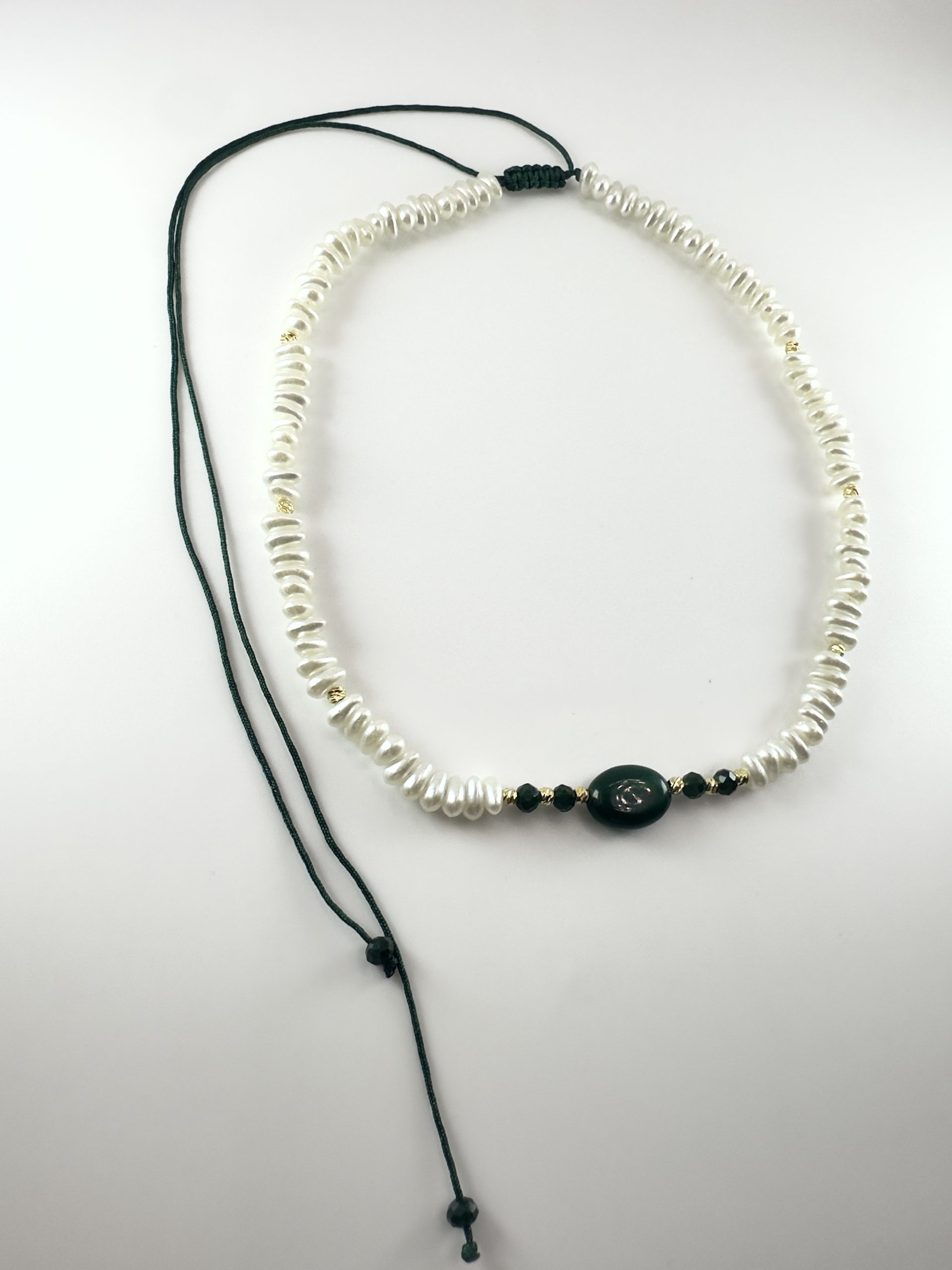 Ce collier raffiné est entièrement monté à la main sur chaîne ajustable. Les perles  symboles de pureté et d’élégance, sont subtilement, apportant modernité et durabilité.